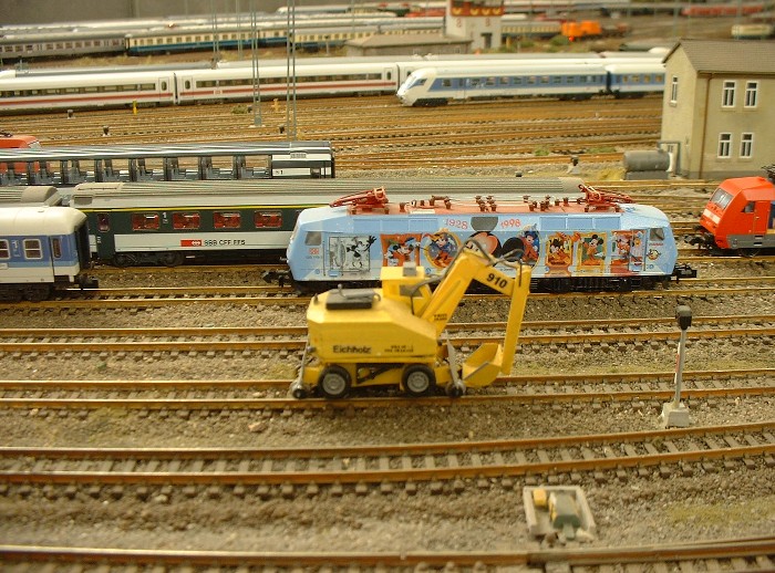 Oben: Ein Zweiwegebagger der Firma Eichholz wartet darauf umsetzen zu können. Das Modell entstand aus Radiergummi, Polystyrol etc.