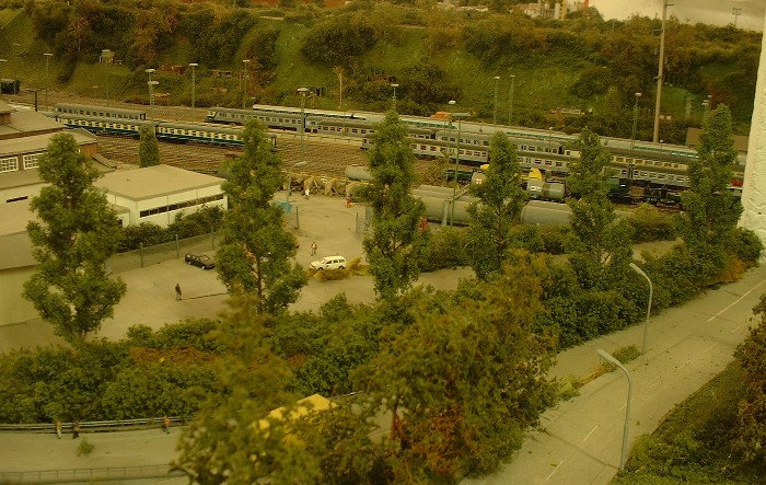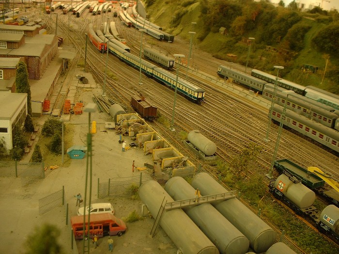 Unten: Ansicht der "P-Gruppe". Der TVT ist ein gesupertes Kleinserienmodell. Ob die Müllsäcke noch abgeholt werden? Der Wasserkran ist noch ein Überbleibsel der Dampflokzeit. Warum abreissen wenn stehen lassen billiger ist? Zumindest ein Teil Nostalgie.