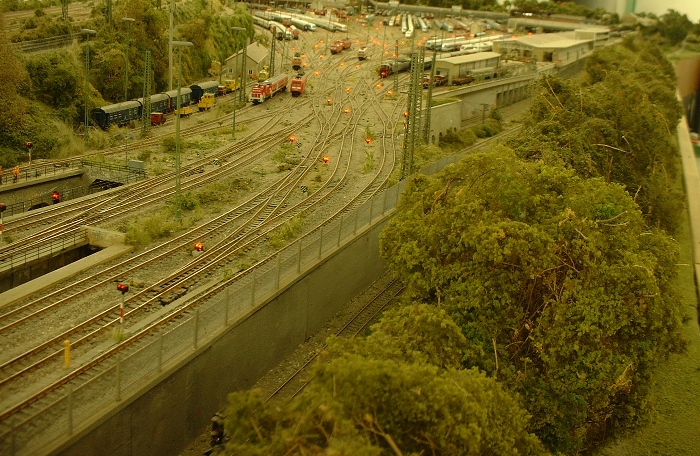 Unten: Hier eine Ansicht über einen Teil des Abstellbahnhofs. Im Hintergrund vor der Betonwand befindet sich die "N-Gruppe". Stellwerk 8 steuert den Bereich des BW 1 Bereiches. Im Vordergrund Züge in der "P" und der "S" Gruppe.