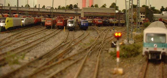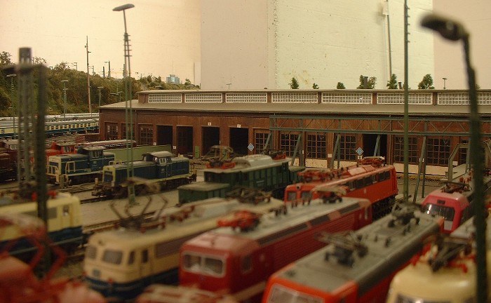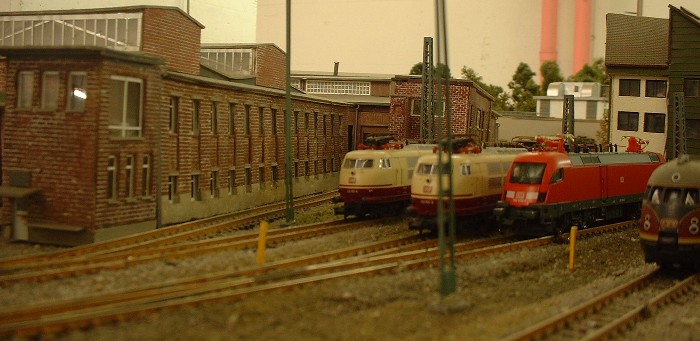 Unten: Abgestellte E-Loks. Da meine Epoche in der Zeit 4/5 angesiedelt ist treffen sich mehrere Farbvarianten. Auch alle gängigen Modellbahnhersteller sind vertreten.