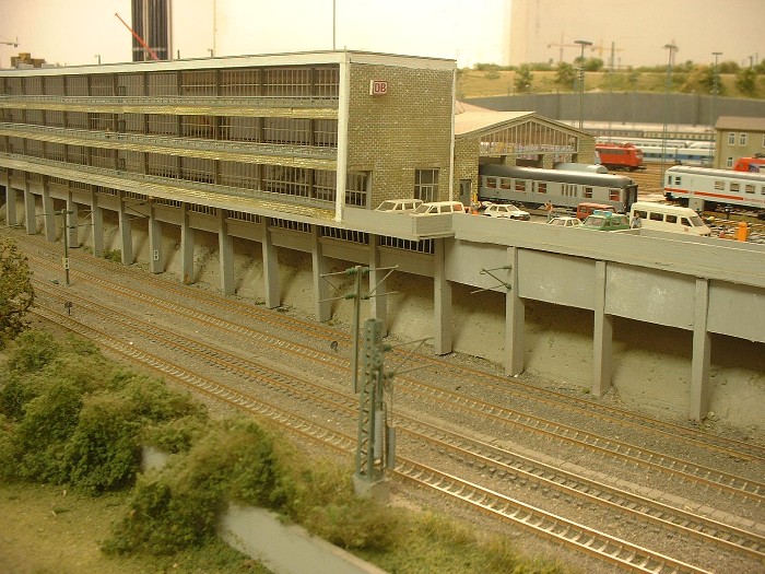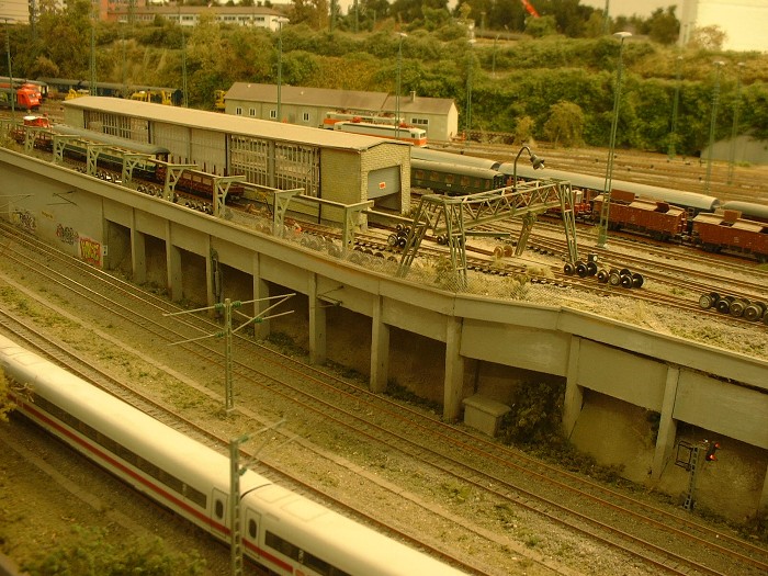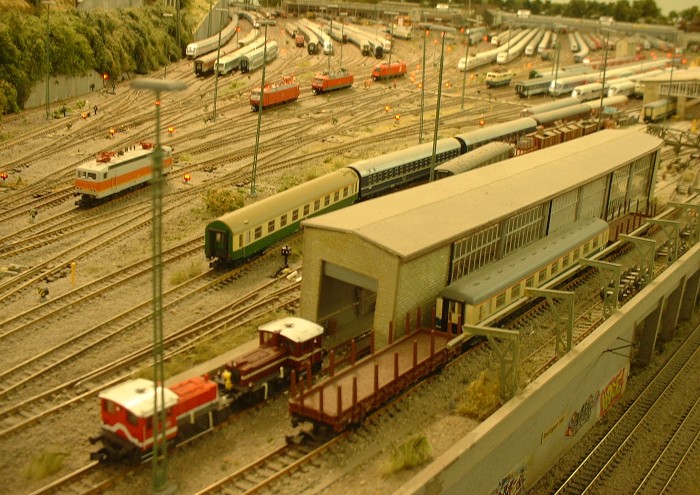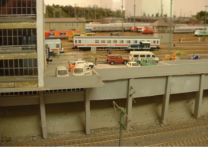 Oben: Das BW 2 von der Parkseite aus gesehen. Im Schichtbetrieb werden die Wagen gewartet. Das Werk hat mehrer Loks die alleine für es arbeiten. Eine Lok der Baureihe 360 zum zu und abfahren der Wagen ( R-Lok ) sowie eine Köf ( Br 333 ) für den Waschbetrieb.