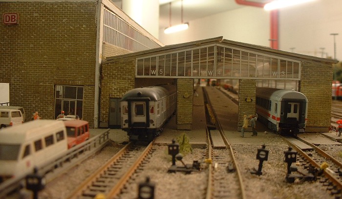 Unten: Einfahrt in dei Wagenhalle von Parkseite aus gesehen. Der Silberling wird demnächst von mir zu einem "Messfahrzeug" umgebaut. Er wartet hier im Gleis "W5" auf sein neues Leben.