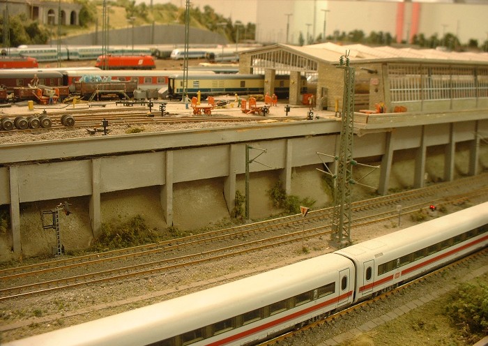 Unten: Ein ICE zur Fahrt nach München passiert das Werk. Die Passagiere ahnen nicht welche enormen Leistungen die Mitarbeiter im Gebäude nebenan unternehmen um die Fahrt in den Wagen der DB angenehm zu gestalten.