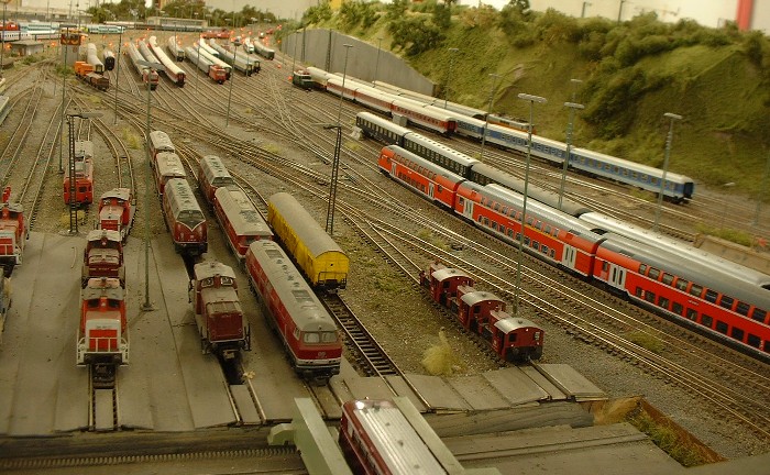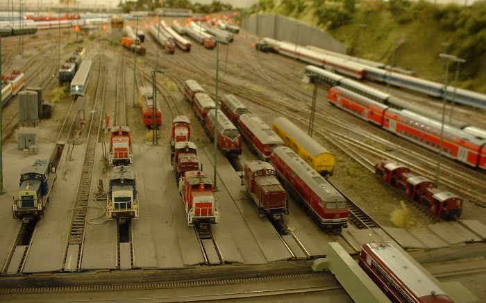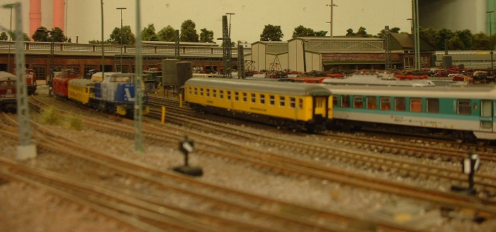 Unten: Der Diesellokbereich mit einem Teil der "N-Gruppe". Die Köfs werden nach Kornwestheim zum "Z-Stellen" überführt. Den gelben Wagen sehen alle Eisenbahner nicht so gerne. Wenn der zum Einsatz kommt hat es irgendwo gekracht. Der Hilfszug ist heute in Kornwestheim stationiert.