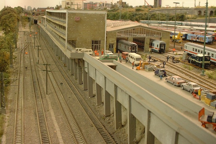 Unten: Die Lokleitung. Von dem kleinen Vorbau des Klinkerbaus werden die Lok`s und das Personal in den Loklauf eingespannt. Daneben die Gleise 597-599 des Bw`s. Der Vt 08 steht im Gleis 731. Dahinter ist ein kleiner Teil des Sozialgebäudes zu sehen. Die gelben Rufsäulen sieht man dort häufig. Von dort aus melden sich die Lokomotivführer nach dem aufrüsten ihrer Maschine beim Stellwerk 8 fahrbereit. Abgerufen werden die Loks per Lautsprecher da in diesem Bereich kein Ortskanal ( Funk ) zur Verfügung steht.
