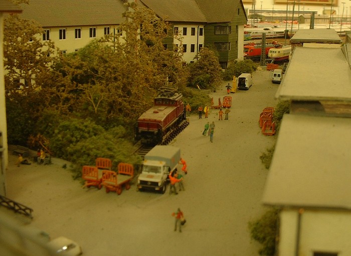 Unten: Der Geschäftsbereich "Fernverkehr" hat Heute eine Dispolok zur IC Reserve angemietet. Im Vordergrund ein Trafo der Weichenheizung. Entstanden aus Plastik und einem Teil Radiergummi.