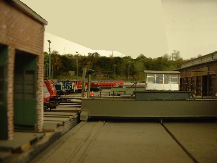 Unten: Nun die Bühne von der entgegen gesetzten Perspektive betrachtet. Das Modell entstand aus einem umgebauten BRAWA Modell. Knut Bühner verschiebt gerne Sachen vor allem Loks.