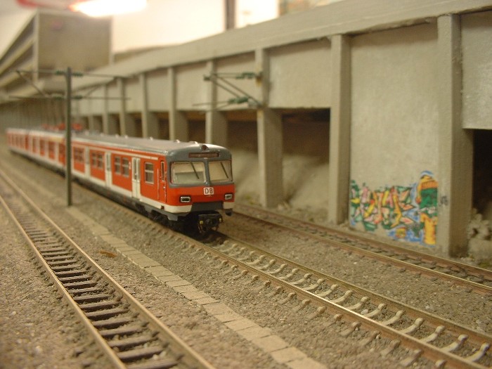 Unten: Die Verbindungsgleise werden von den Fern und S-Bahngleisen von und nach Bad Cannstatt unterfahren. Hier ein ET420 Kurzzug auf seiner Fahrt von Hauptbahnhof Tief nach Cannstatt. Die Modelle des ET 420 auf meiner Anlage sind alle umgebaut. So wurden viele Fahrzeuge auf das neue Farbschema getrimmt. Ebenso wurden Rolläden im Führerstand, abmehmbahre Schaku und Scheibenwischer eingebaut. Sogar das Mikrofon für den Lokführer ist vorhanden. Auch die Innenausrüstung wurde farblich angepasst. Diesem Modell unten fehlen noch ein paar Beschriftungsdetails ansonsten ist es für den Anlagenbetrieb fertig.