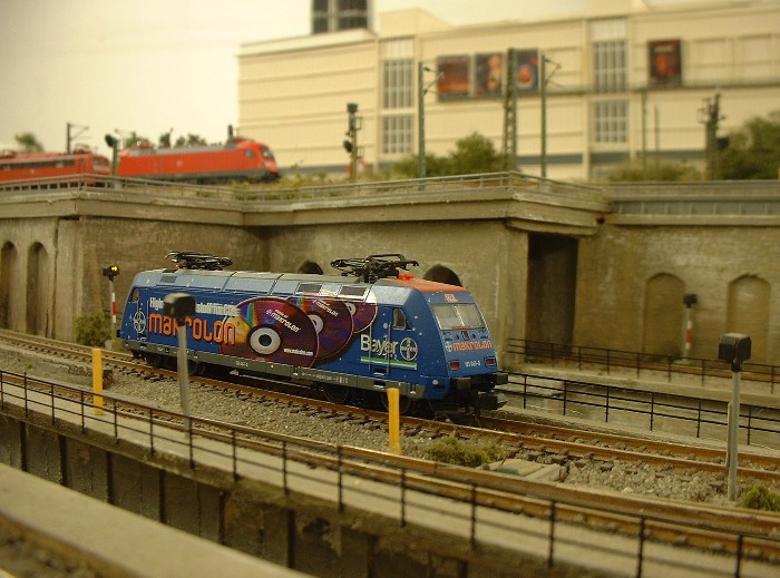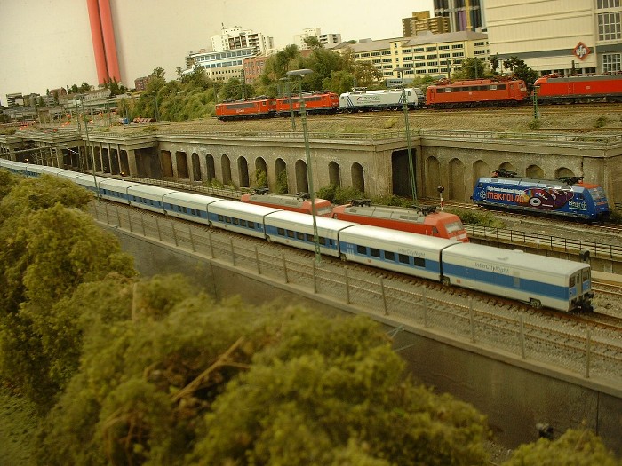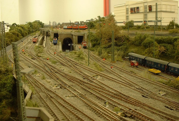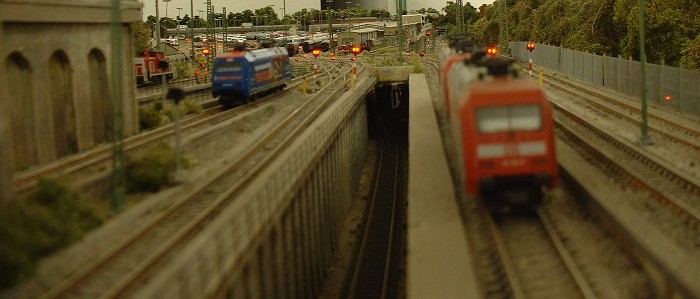 Unten: Eine Lok der Baureihe 101 im Verbindungsgleis 502. Sie wartet auf Einfahrt in den Abstellbahnhof. Im linken Teil ist noch ein Signal zu erkennen das das Lokpersonal und die Rangierleiter informieren ob die Einfahrt in den Personenbahnhof oder Abstellbahnhof gestattet ist. Diese Signale zeigen nur "Sh1" oder "Kennlicht". Diese Signalbauform wurde extra für den Stuttgarter Hauptbahnhof entwickelt. Die Sprechsäulen wurden aus gestanzten Polystyrolplatten gebastelt. Dazu eignet sich sehr gut alte Abbrechklingen und ein Hammer.